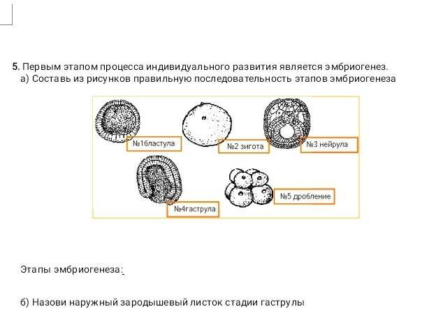 этапы эмбриогенеза: 2.зигота, 5. дробление, 1.бластула, 4.гаструла, 3.нейрула
