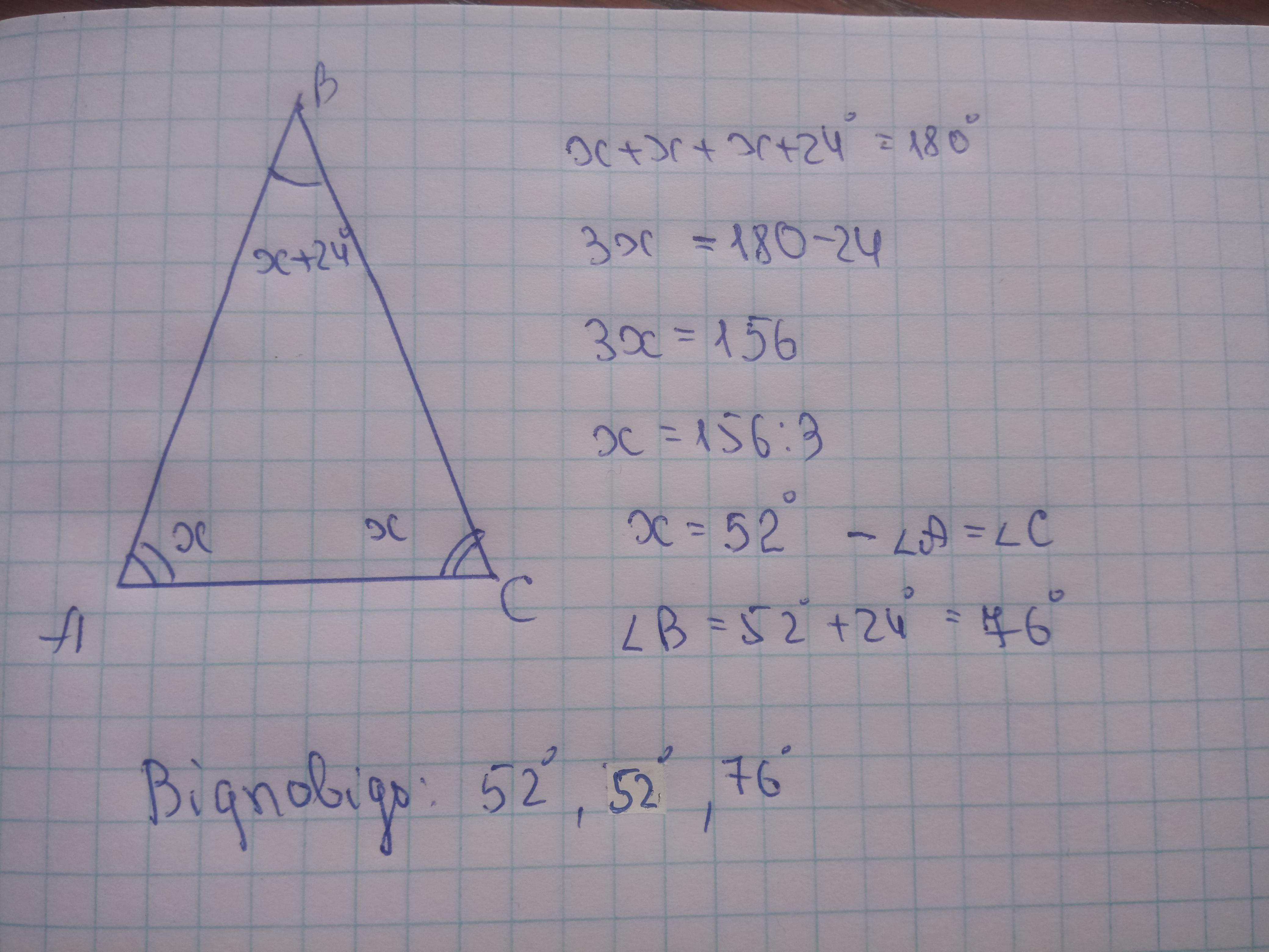 Знайдіть кути рівнобедреного трикутника якщо кут при вершині на 24⁰ більший за кут при основі