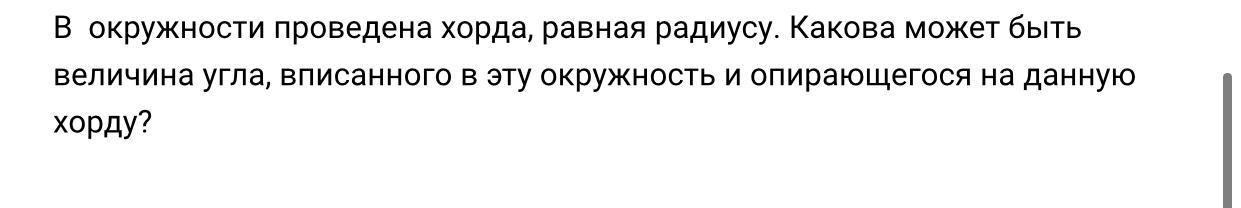 Значит вписанный угол, опирающийся на хорду будет , равен половине центрального , то есть 30
