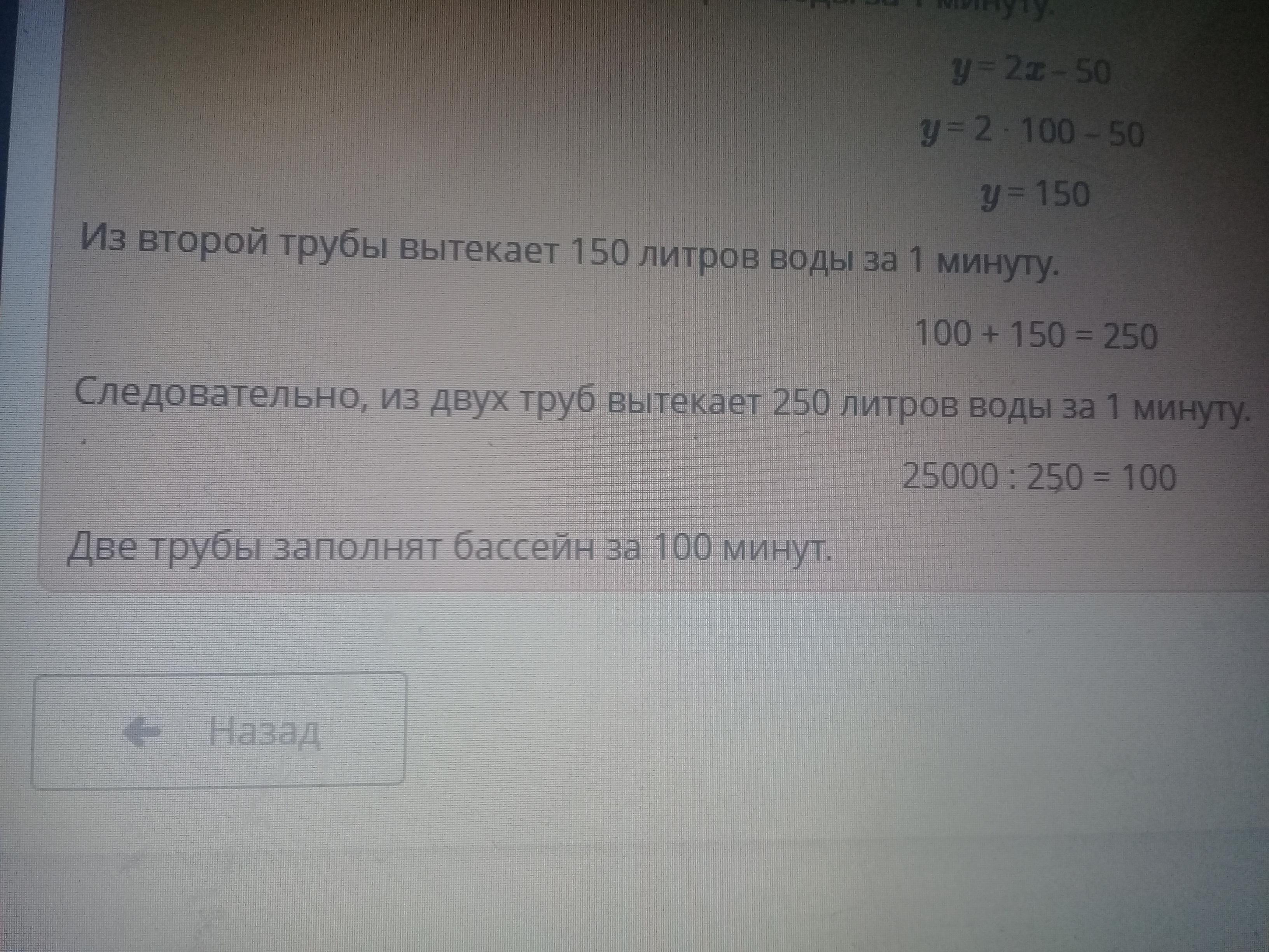 Две трубы заполняют бассейн объемом 25000 литров. Из первой трубы за 4 минуты вытекает на 100 литров воды больше, чем из второй трубы за 2 минуты. Из первой трубы за 3 минуты вытекает на 450 литров меньше, чем из второй трубы за 5 минут. Найди, за сколько минут заполнят бассейн объемом в 25000 литров две трубы одновременно.