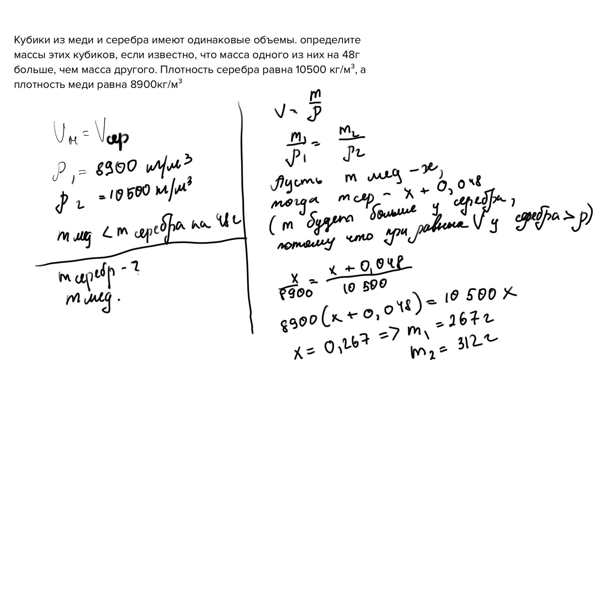 Кубики из меди и серебра имеют одинаковые объемы. определите массы этих кубиков, если известно, что масса одного из них на 48г больше, чем масса другого. Плотность серебра равна 10500 кг/м³, а плотность меди равна 8900кг/м³