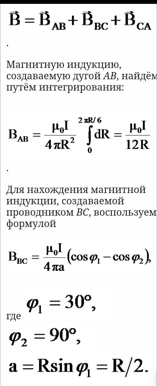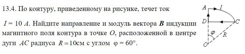 По контуру, приведенному на рисунке, течет ток I= 10А. Найдите направление и модуль вектора В индукции магнитного поля контура в точке О, расположенной в центре дуги АС радиуса 10м с углом φ = 60 градусов.