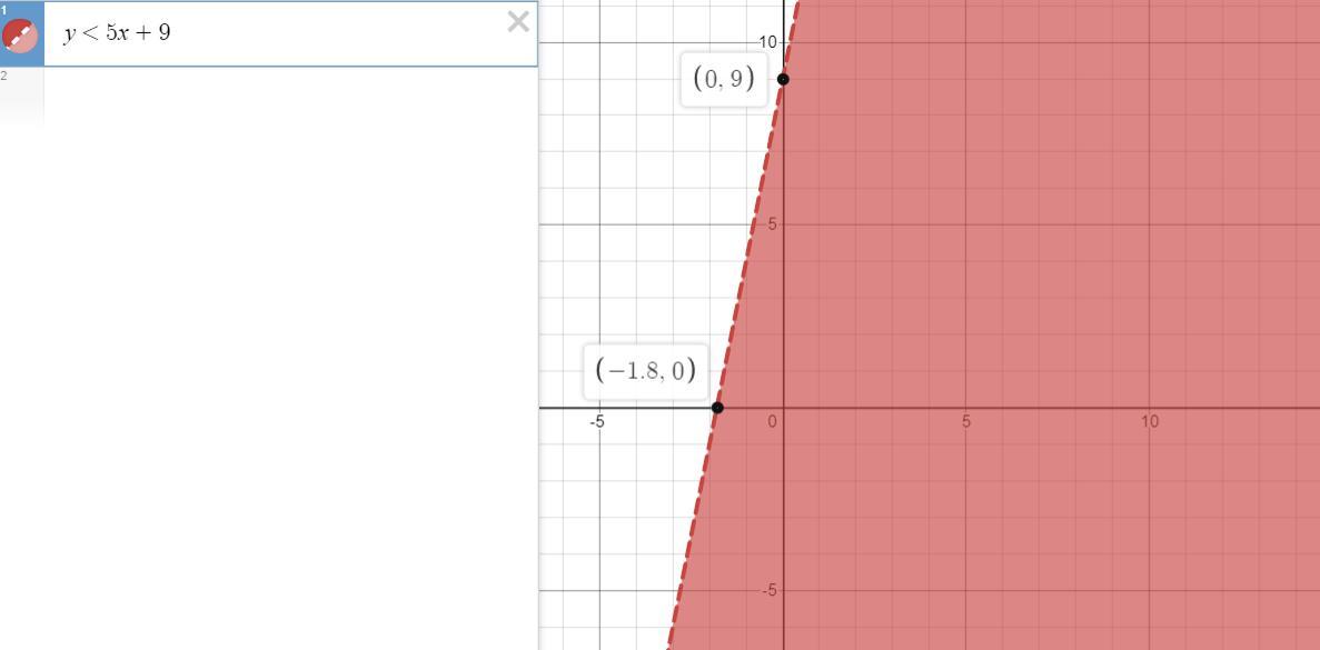 строим график функции у=5х+9 и отмечаем область, лежащую ниже этого графика