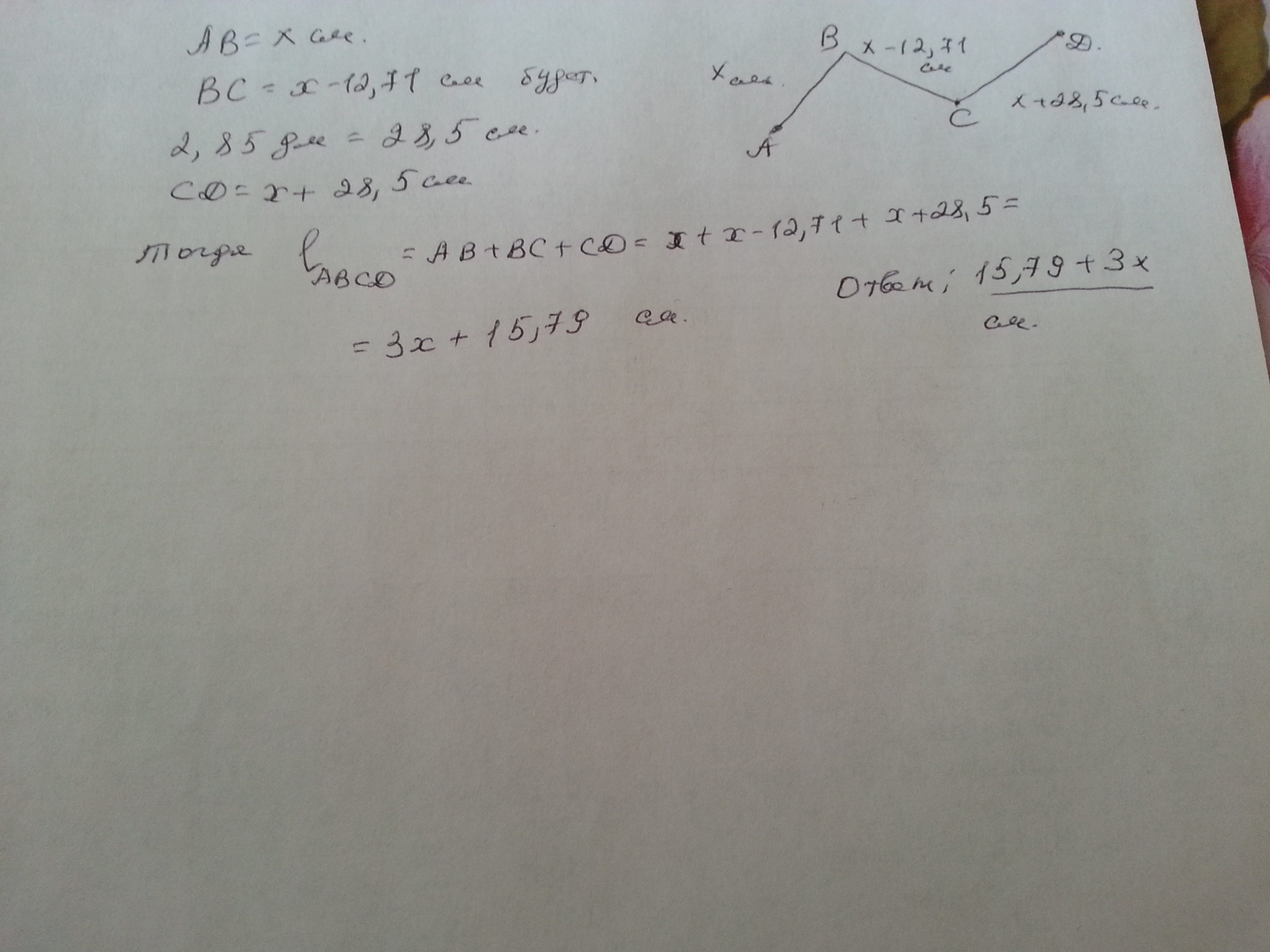 Составьте выражение для длины незамкнутой ломаной АВСД, если АВ = х см, ВС на 12,71 см меньше АВ, а СД на 2,85 дм больше АВ. Упростите полученное выражение.