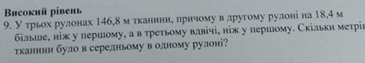 помогите пожалуйста перевод: 9. В трех рулонах 146,8 м ткани, причем во втором рулоне на 18.4 м больше, чем в первом, а в третьем вдвое, чем в первом. Сколько метров ткани было в среднем в одном рулоне?