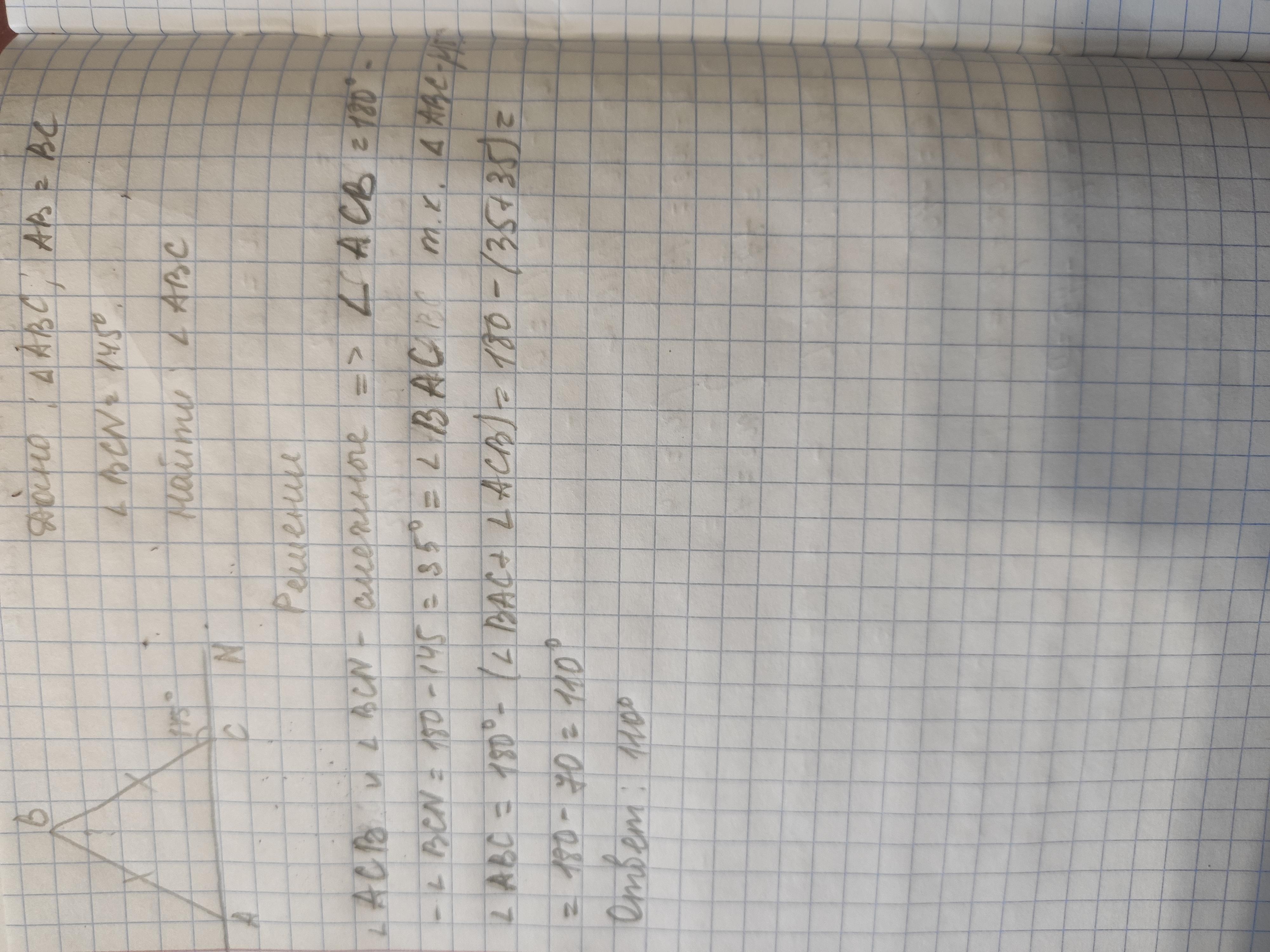 В равнобедренном треугольнике АВС соснованием АС внешний угол при вершине C равен 145* Найдите величину угла АВС . Ответ дайте в градусах