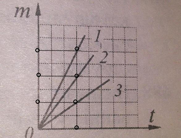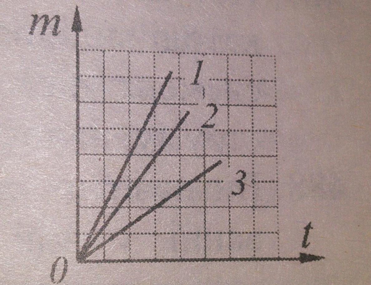 На рисунке изображены графики зависимости массы вещества, выделяемого на катодах, от времени для трех электролитических ванн с раствором сульфата меди (медного купороса), которые подключены к одинаковым источникам тока. Сравнить сопротивления электролитов, находящихся в ваннах.