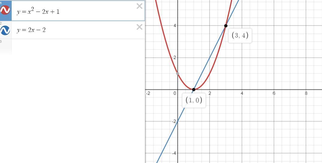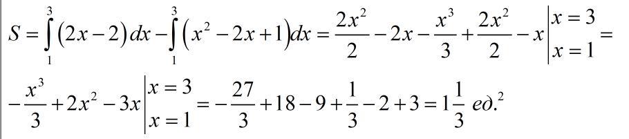 найдем пределы интегрирования: x²-2x+1=2x-2⇒x²-4x+3=0⇒x₁=3, x₂=1