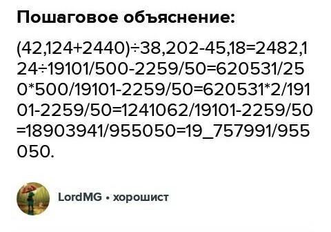 (42.124+2440):38.202-45.18=2482.124:19101/500 - 2259/50=620531/250 *500/19101 - 2259/50=620531*2/19101-2259/50=1241062/19101-2259/50=18903941/955050≈19.79367