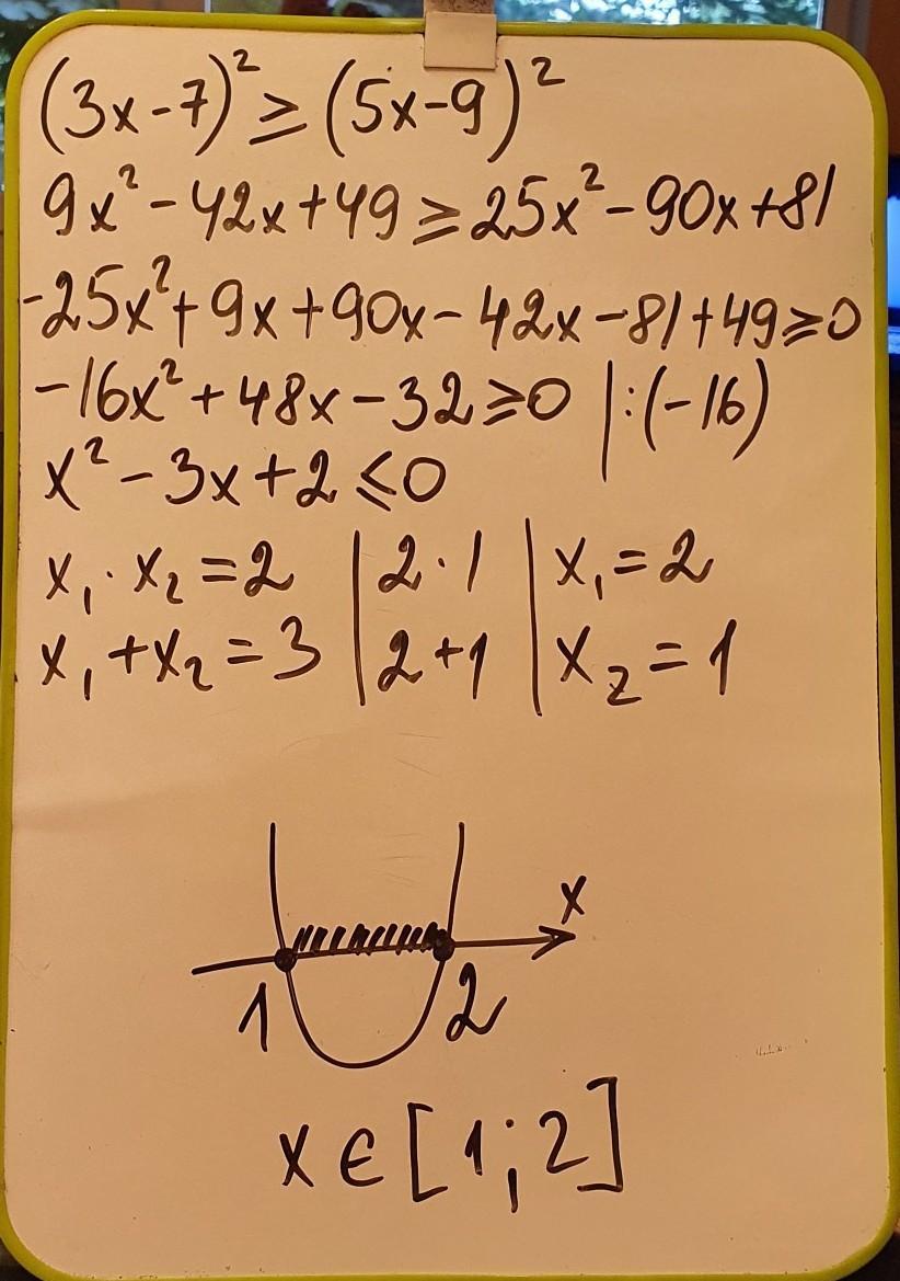 ▪︎4 шаг на числовом луче отмечаем наши корни 1 и 2, т.к. нерааенство не строгое => наши точки закрашенные и они входят в промежуток. Рисуем параболу и отмечаем промежуток меньше 0