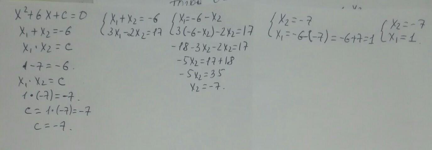 Корни x1 и х2 уравнения х2 + 6х + с = 0 удовлетворяют условию 3х1-2х2 = 17 найдите значение с