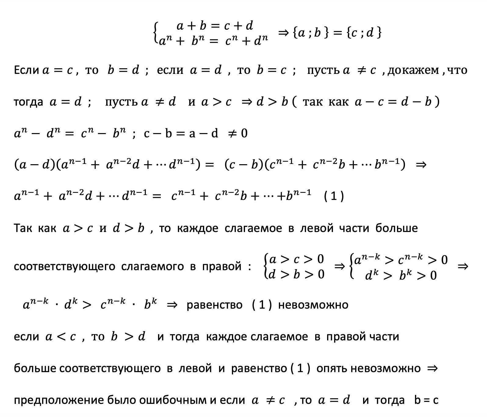 где n - натуральное число. Доказать, что множество, состоящее из чисел a и b, совпадает с множеством, состоящим из чисел c и d.