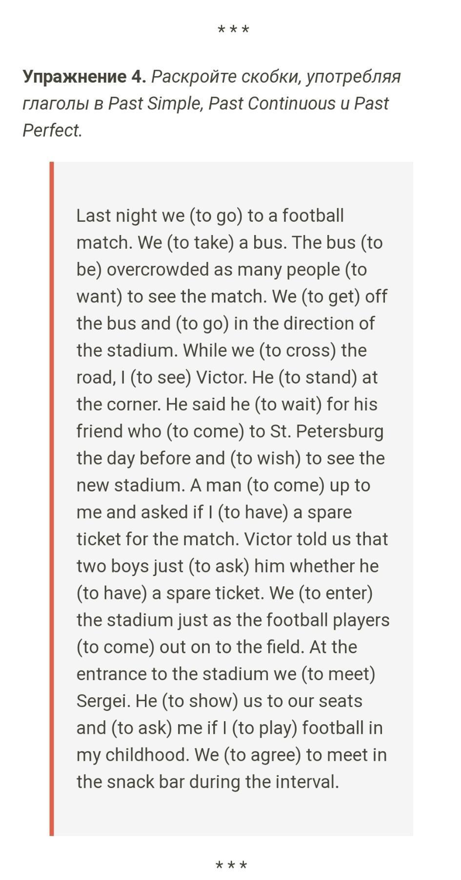 Last night we went to a football match. We took a bus. The bus was overcrowded as many people wanted to see the match. We got off the bus and went in the direction of the stadium. While we were crossing the road, I saw Victor. He was standing at the corner. He said he was waiting for his friend who had come to St. Petersburg the day before and wished to see the new stadium. A man came up to me and asked if I had a spare ticket for the match. Victor told us that two boys had just asked him whether he had a spare ticket. We entered the stadium just as the football players were coming out on to the field. At the entrance to the stadium we met Sergei. He showed us to our seats and asked me if I played football in my childhood. We agreed to meet in the snack bar during the interval.