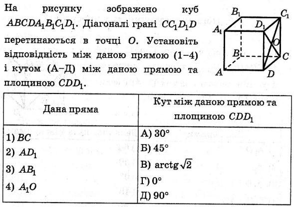 ABCDA1B1C1D1. Діагоналі грані CC1D1D перетинаються в точці О. Установіть відповідність між даною прямою (1-4) і кутом (А-Д) між даною прямою та площиною CDD1.
