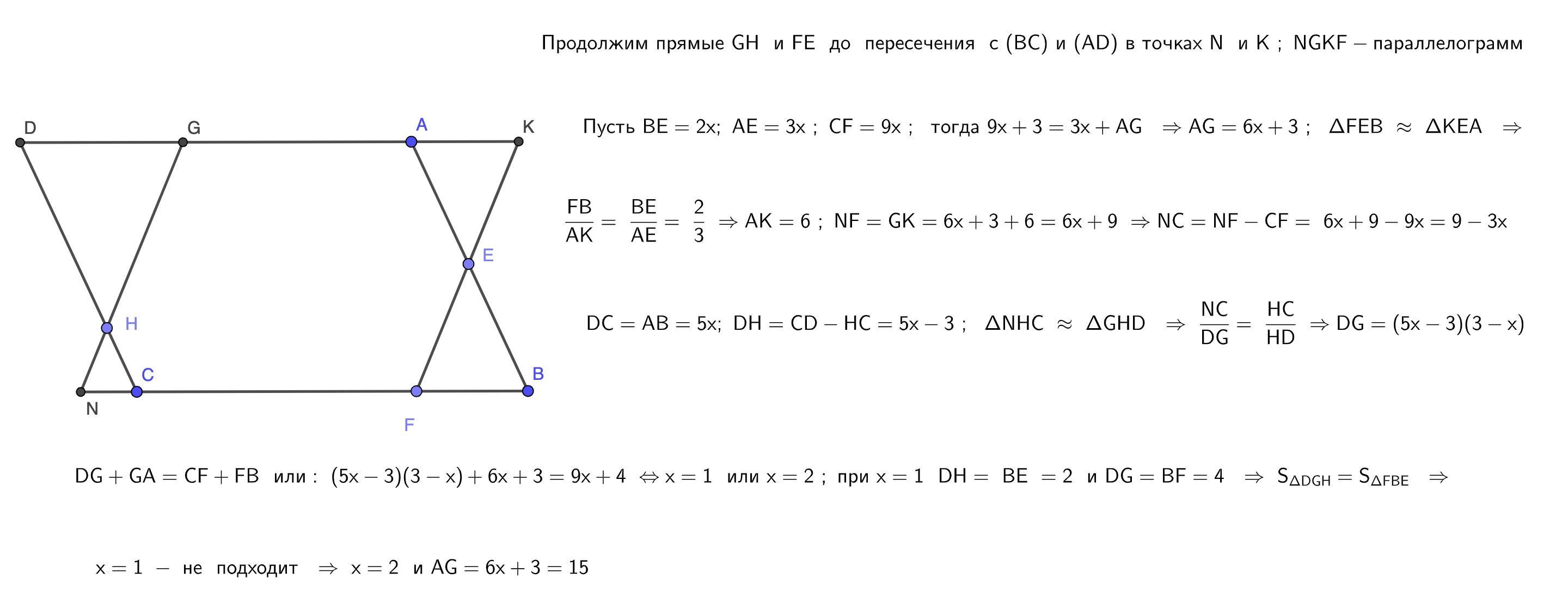 На рисунке 20 . Параллелограмм ABCD ; в котором BC длиннее AB ; точки Е , F , G и H точки находятся на сторонах AB , BC , DA и CD соотвественно ; так что EF // GH . Если Площадь ΔBEF не равна площади Δ DGH ; и FC+CH=EA+AG . А также BE:AE: CF=2:3:9 ; BF=4 , CH=3 . Найдите длину AG =?