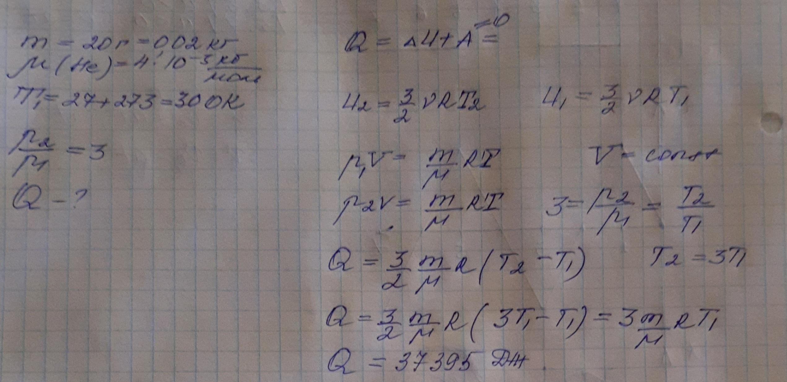 В закрытом герметичном сосуде находится 20 г гелия при температуре 27оС. Какое количество теплоты необходимо сообщить газу, чтобы его давление увеличилось в 3 раза?