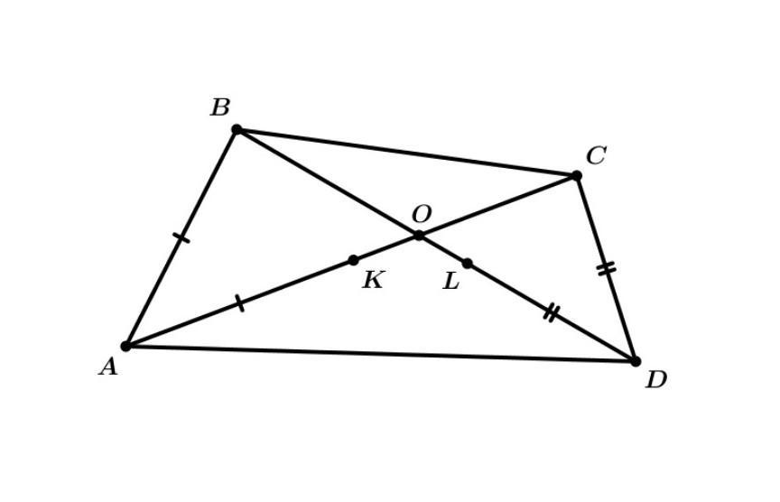 Диагонали вписанного четырёхугольника ABCD пересекаются в точке O. На его диагоналях AC и BD отметили точки K и L соответственно так, что AK=AB и DL=DC. Выберите все гарантированно верные утверждения.