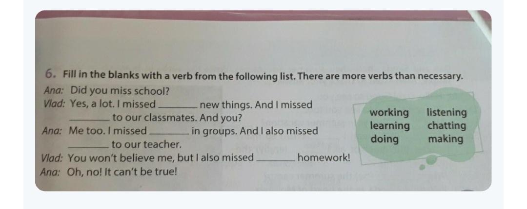 Vlad: Yes, a lot. I missed ______new things. And I missed_____ working listening to our classmates. And you? learning chatting
