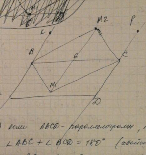 В параллелогрмме АВСД биссектрисы углов АВС и ВСД пересекаются в точке М. На продолжениях отрезков прямых АВ и СД взяты точки К и Р. Биссектрисы углов КВС и ВСР пересекаются в точке М2, М1 М2= 8 см. Найдите АД.