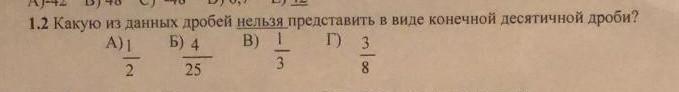 1.2 Какую из данных дробей нельзя представить в виде конечной десятичной дроби? А)1/2 Б)4/25 В)1/3 Г)3/8
