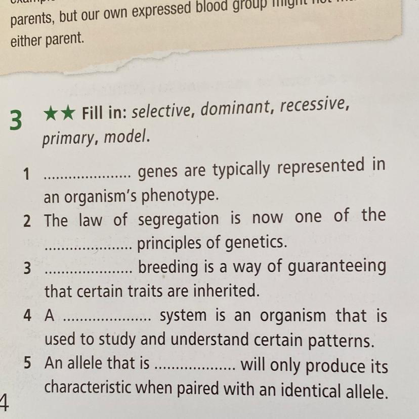Fill in: selective, dominant, recessive,primary, model.