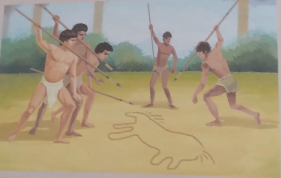На картине изображено дикое племя людей, которые делают специальный обряд перед охотой, что бы она была удачливой. На земле изображено животное, пять членов племени в юбках из кожи животных, с копьями точут ими в землю. Трое в тело, один юноша в голову, другой в шею. Все происходит на небольшой поляне рядом с лесом, в который пойдут охотятся наши юношы. Им надо добыть много еды что бы прокормить все племя)