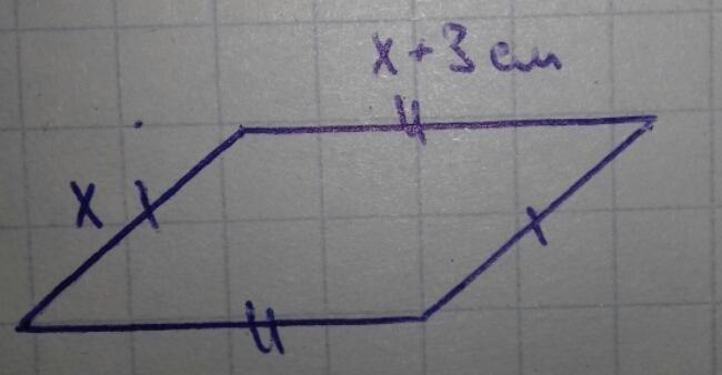 Пусть меньшая сторона равна x, тогда противоположная ей, равна x, а смежные с ней, равны x+3см.