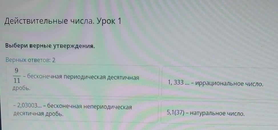 Действительные числа. Урок 1 Выбери верные утверждения. Верных ответов: 2 9 бесконечная периодическая десятичная 11 дробь. 1, 333 ... – иррациональное число. - 2,03003... - бесконечная непериодическая десятичная дробь. 5,1 (37) – натуральное число.