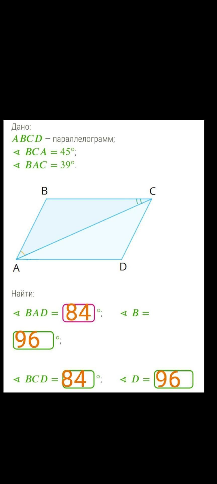 <BAD=180-96=84 (односторонние в сумме 180 градусов)