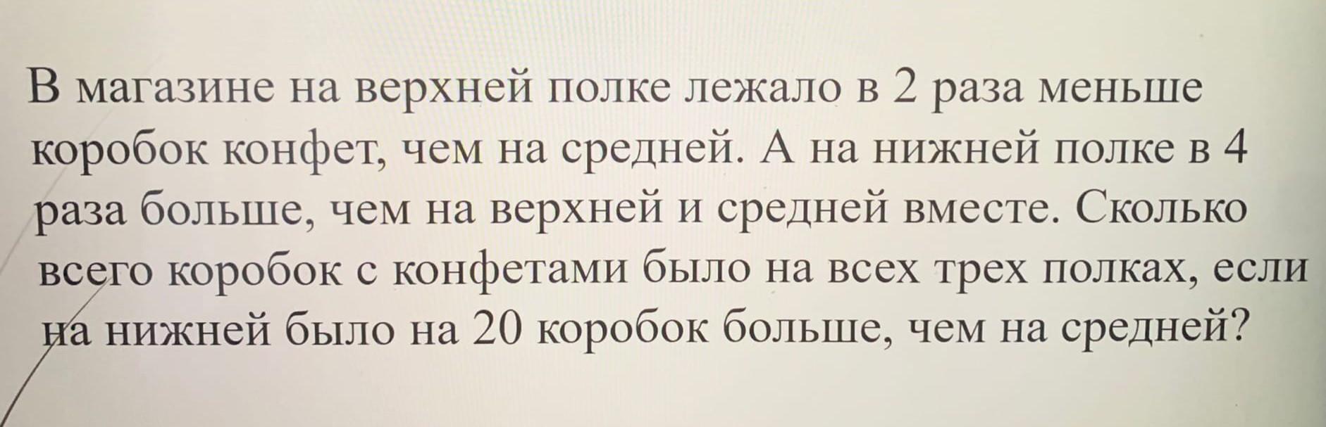 Ответ: на верхней полке - 2 коробки, на средней - 4, на нижней - 24.