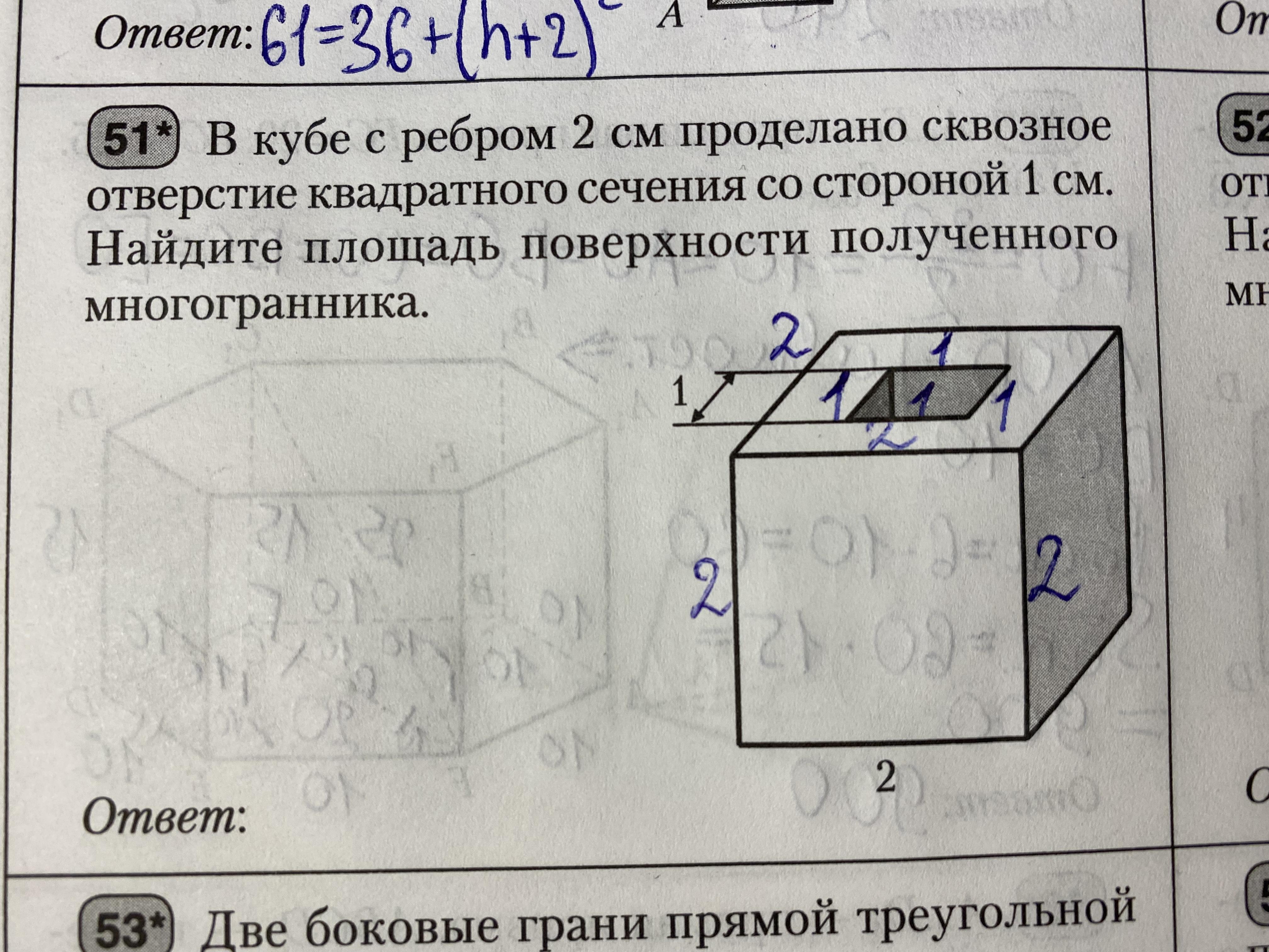 5) 24-2=22 (см2) - площадь куба, не считая отверстий