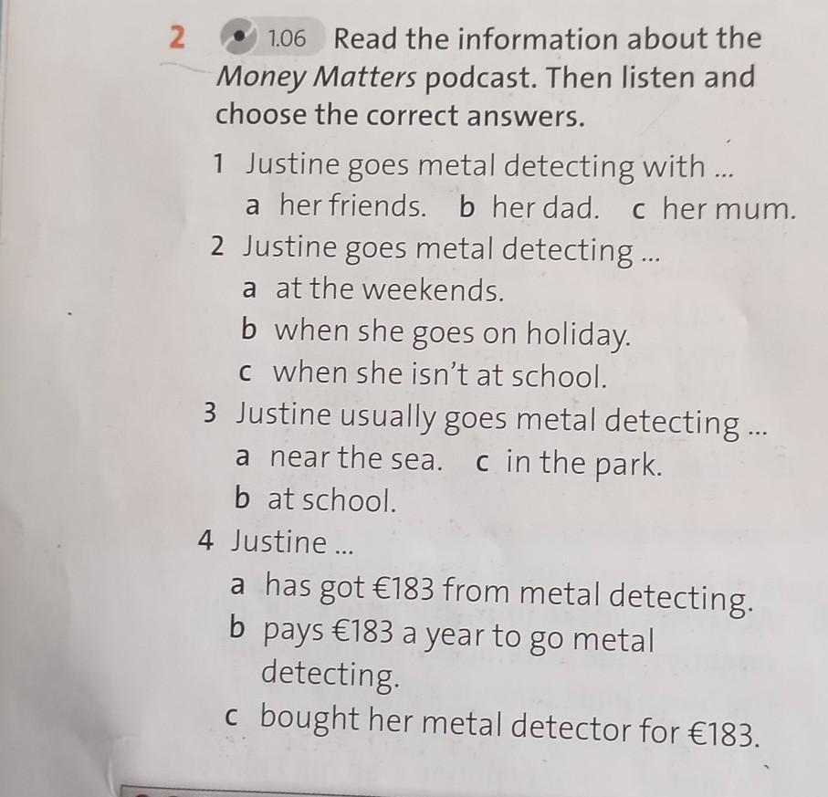 1.06 2 Read the information about the Money Matters podcast. Then listen and choose the correct answers. 1 Justine goes metal detecting with ... a her friends. b her dad. c her mum. 2 Justine goes metal detecting ... a at the weekends. b when she goes on holiday. c when she isn't at school. 3 Justine usually goes metal detecting ... a near the sea. c in the park. b at school. 4 Justine ... a has got €183 from metal detecting. b pays €183 a year to go metal detecting c bought her metal detector for €183.