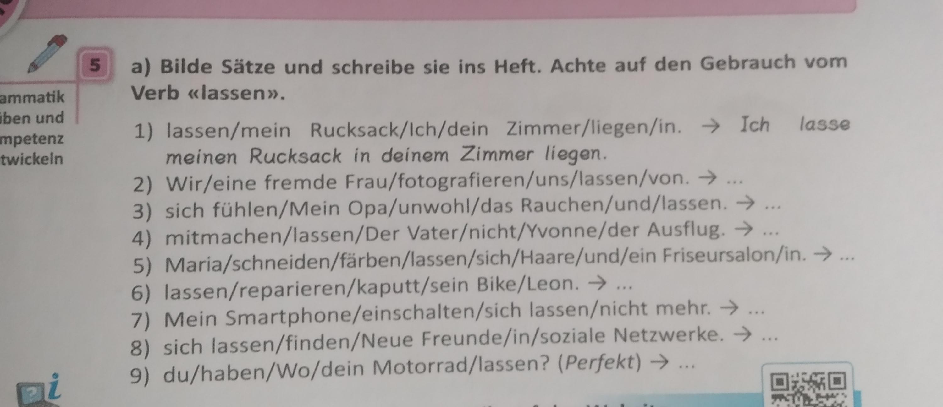 Bilde Sätze und schreibe sie ins Heft. Achte auf den Gebrauch vom Verb "lassen"
