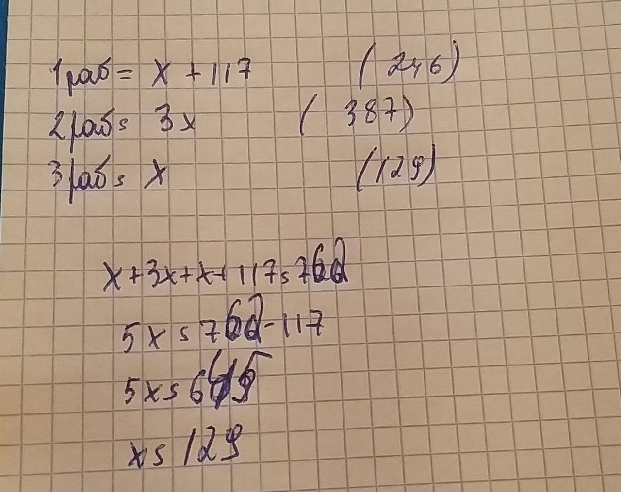 представим что 3 рабочий это Х, тогда первый рабочий это Х+117 потому что так сказано в условиях задачи( первый изготовил на 117 больше нежели 3) , а второй рабочий изготовил в 3 раза больше ,чем 3 , а значит 3Х и потом составляем уравнение из данных ,ну там понятно все. итого: