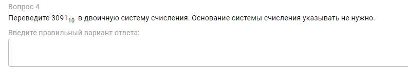 Переведите 309110 в двоичную систему счисления. Основание системы счисления указывать не нужно.