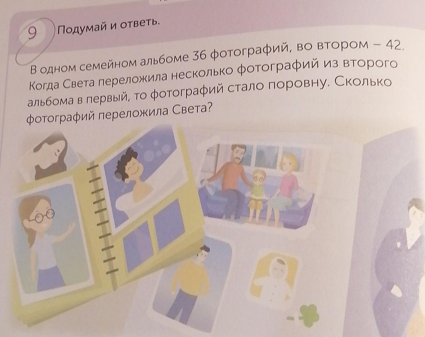 ТЫ ИССЛЕДОВАТЕЛЬ 9 Подумай и ответь. 42. В одном семейном альбоме 36 фотографий, во втором Когда Света переложила несколько фотографий из второго альбома в первый, то фотографий стало поровну. Сколько фотографий переложила Света?