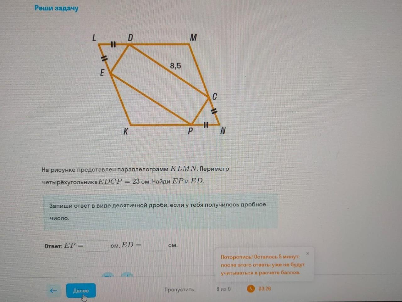 Чтобы найти ED, нужно из 23 см - 17 (8,5*2 (речь про DC и EP)) = 6, т.к. у нас две стороны, то 1 сторона (ED = 3 => PC = 3 см)