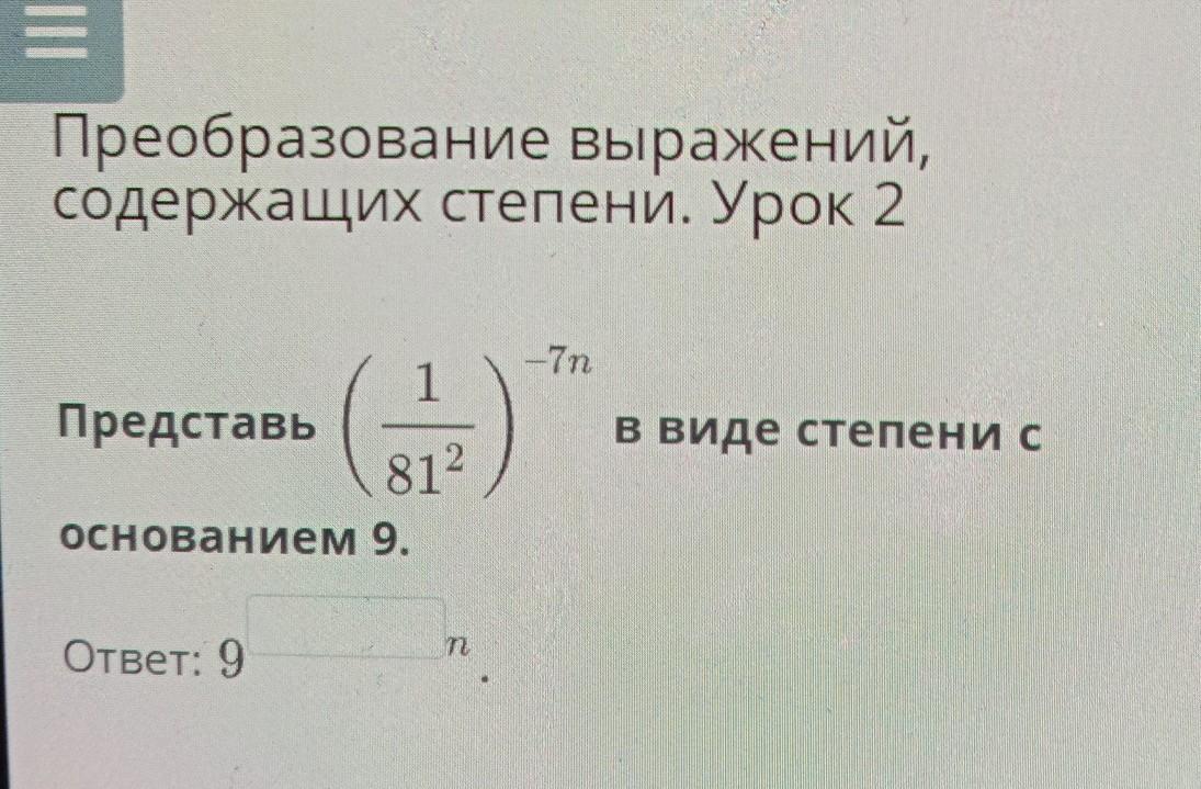 Преобразование выражений, содержащих степени. Урок 2 Представь( 1/81²)-7основанием 9.