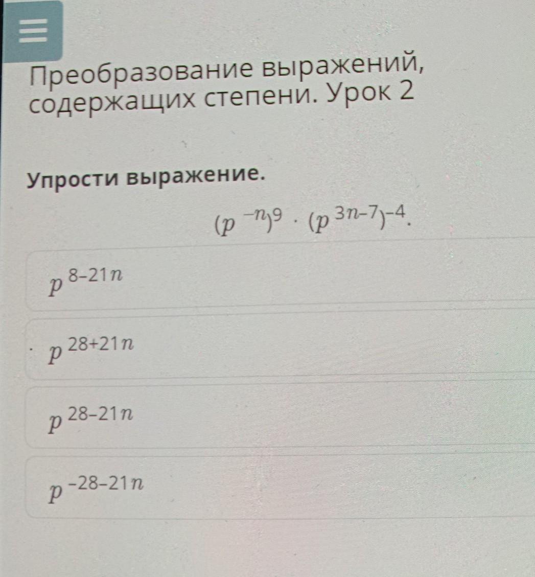 = Преобразование выражений, содержащих степени. Урок 2 Упрости выражение. (р-n) 9*(p³n-7)-4