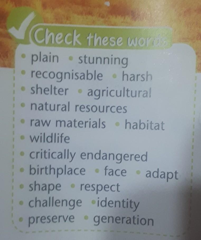 • plain • stunning • recognisable harsh • shelter • agricultural natural resources • raw materials - habitat • wildlife • critically endangered birthplace face • adapt shape respect challenge identity preserve generation
