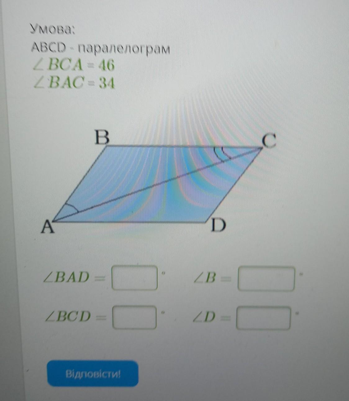 ∠BAD = 68 , т.к. ∠A = 34, а т.к. прямая АС делит угол параллелограмма на два, то, угол ∠А = 34 * 2 = 68, т.е. угол ∠А изначально был 68