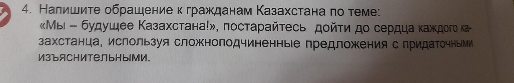 4. Напишите обращение к гражданам Казахстана по теме: «Мы — будущее Казахстана!», постарайтесь дойти до сердца каждого ка захстанца, используя сложноподчиненные предложения с придаточными Изъяснительными.