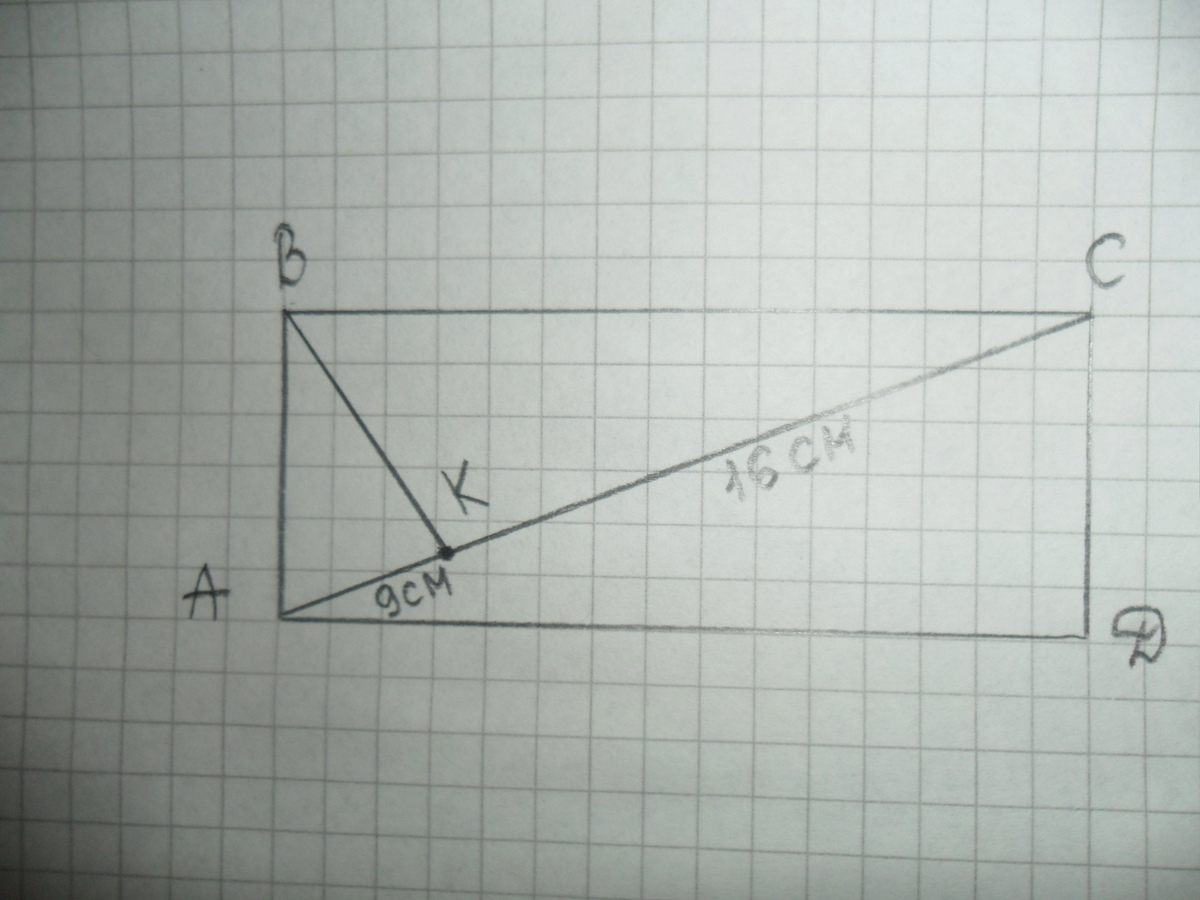 из вершины прямоугольника на диагональ опущен перпендикуляр, который делит её на отрезки длиной 9см и 16 см. найдите тангенс угла, образованного меньшей стороной и диагональю