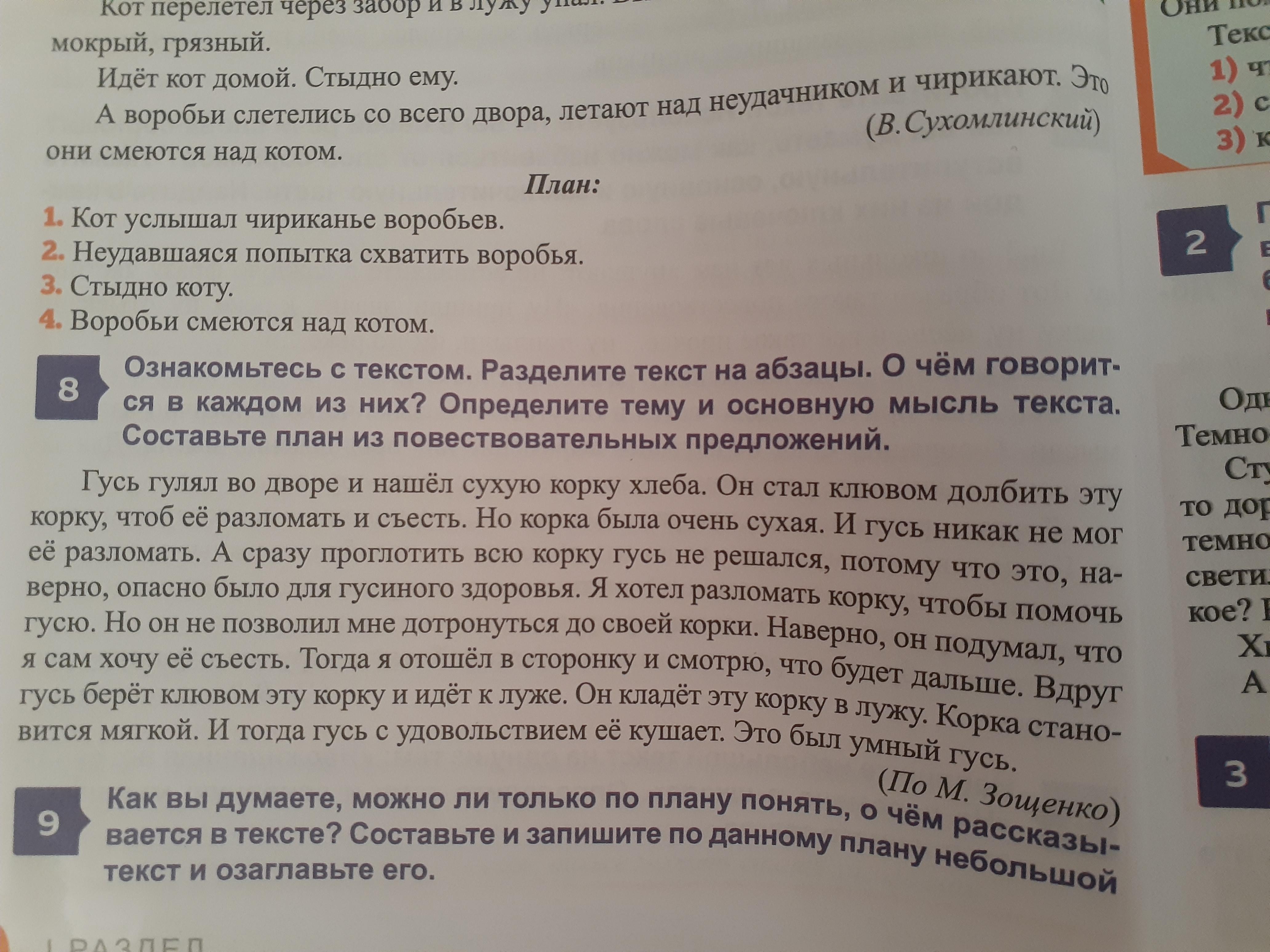 ответ: 1) от слова гусь до слова здоровья первый абзац второй абзац я хотел разломать корку до что будет дальше. 3 абзац от вдруг до это был умный густ 2) основная мысль текста про то как гусь пытался съесть корку засохшего хлеба.