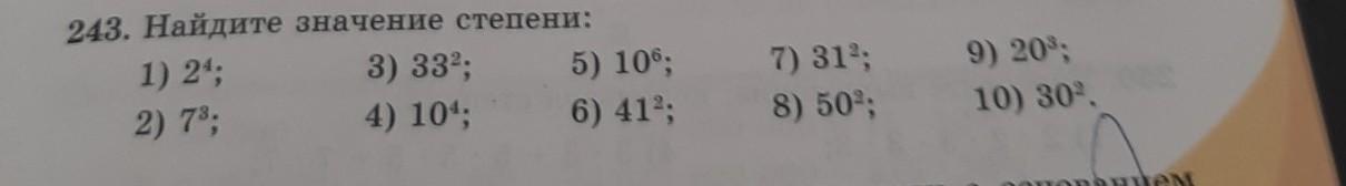 ПОМОГИТЕ ПЖ 243. Найдите значение степени: 1) 24; 3) 332; 5) 106; 2) 73; 4) 104; 6) 412; 7) 312; 8) 502; 9) 203; 10) 30