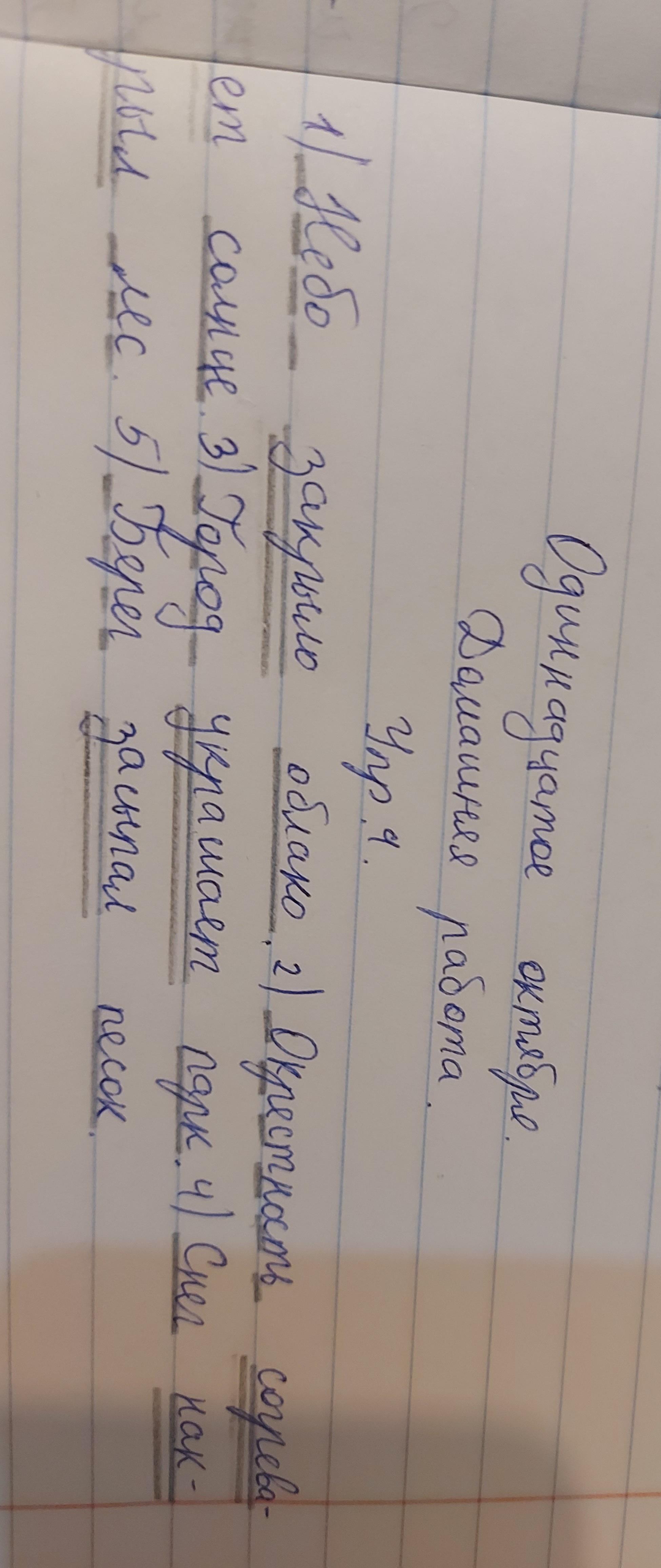 4 Найдите подлежащее и дополнение. Подчеркните их как члены предложения, 1) Небо закрыло облако. 2) Окрестность согревает солнце. 3) Город украшает парк. 4) Снег накрыл лес. 5) Берег засыпал песок.