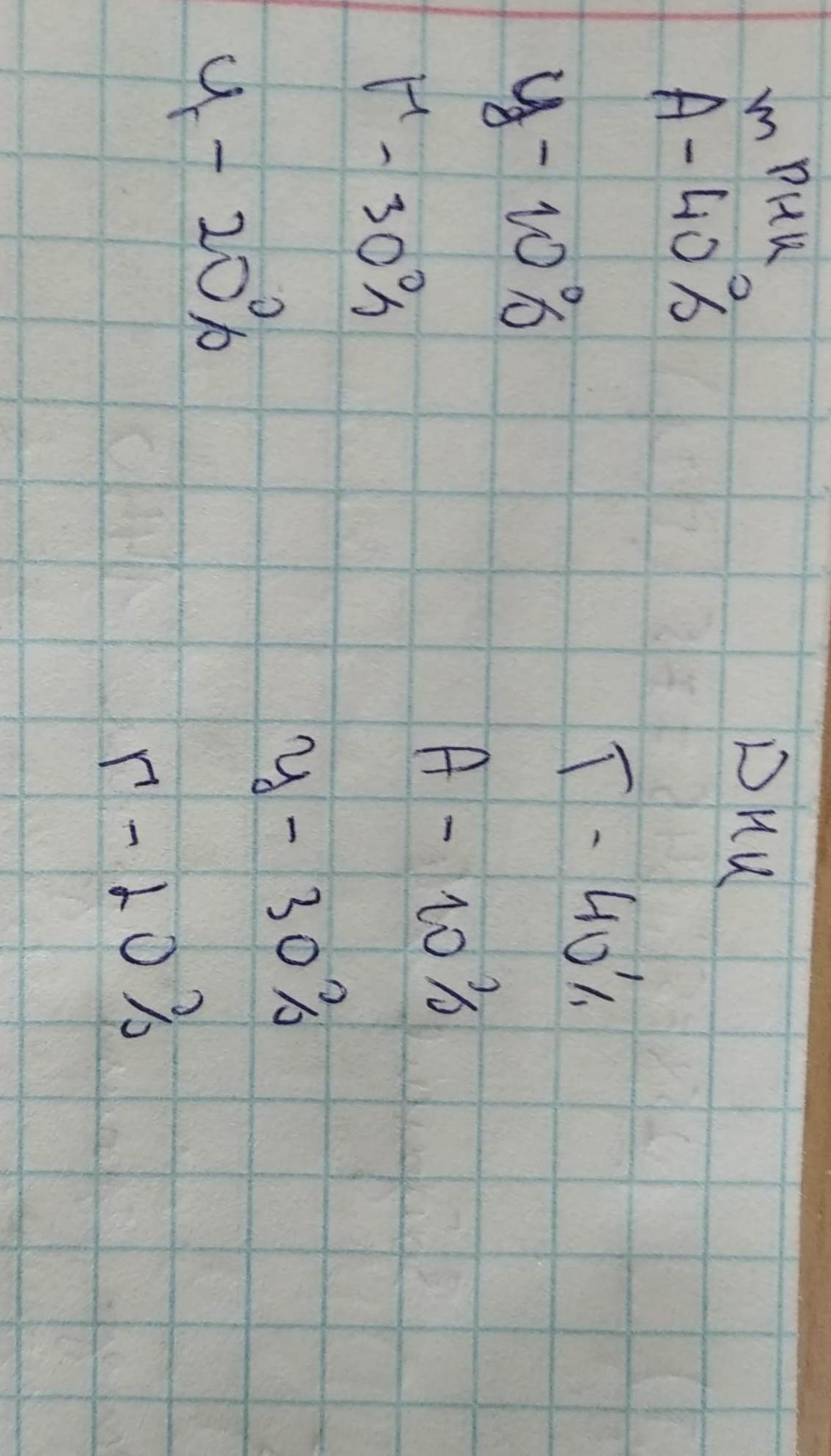 В молекуле тРНК 40% – А, 10% – У, 30% – Г и 20% – Ц. Почему не соблюдается принцип комплементарности? Каков процентный состав нуклеотидов гена, кодирующего данную тРНК?