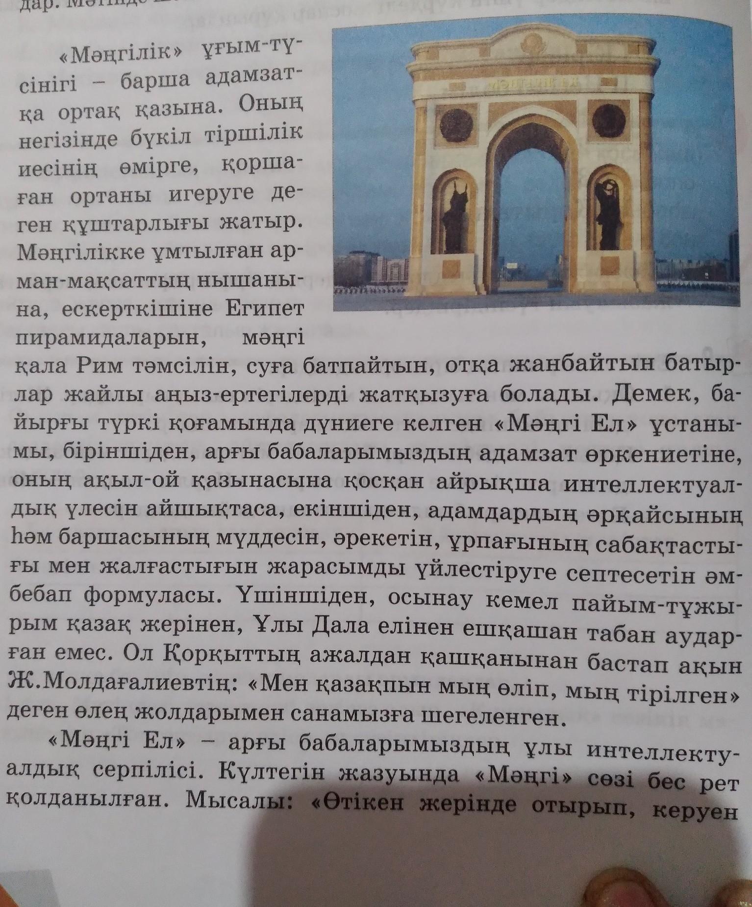 « Қазақстан – менің Отаным, мен үшін жауапты екені сияқты мен де ол үшін жауаптымын» деген қарапайым ойды бойына сіңіріп өсуі тиіс емес пе? «Қазақстан- біздің ортақ үйіміз, біздің өзіміз де, біздің бабаларымыз да осы жерді мекен етеді. Егер біз өзіміздің өмірімізді ,туған жеріміздің қадірін білер болсақ, оны жасампаздықпен жаңғыртып, бой көрсеткен әрбір талшыбықты мәпелеп өсіріп отырмасақ, онда біз өзімізді нағыз патриот деп санай алмас едік.