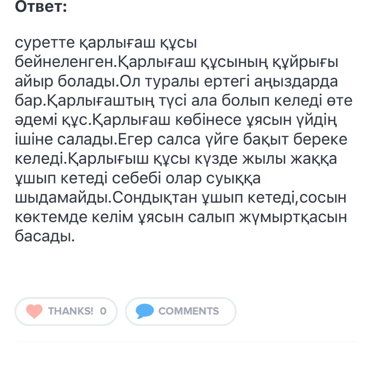 суретте қарлығаш құсы бейнеленген.Қарлығаш құсының құйрығы айыр болады.Ол туралы ертегі аңыздарда бар.Қарлығаштың түсі ала болып келеді өте әдемі құс.Қарлығаш көбінесе ұясын үйдің ішіне салады.Егер салса үйге бақыт береке келеді.Қарлығыш құсы күзде жылы жаққа ұшып кетеді себебі олар суыққа шыдамайды.Сондықтан ұшып кетеді,сосын көктемде келім ұясын салып жүмыртқасын басады.