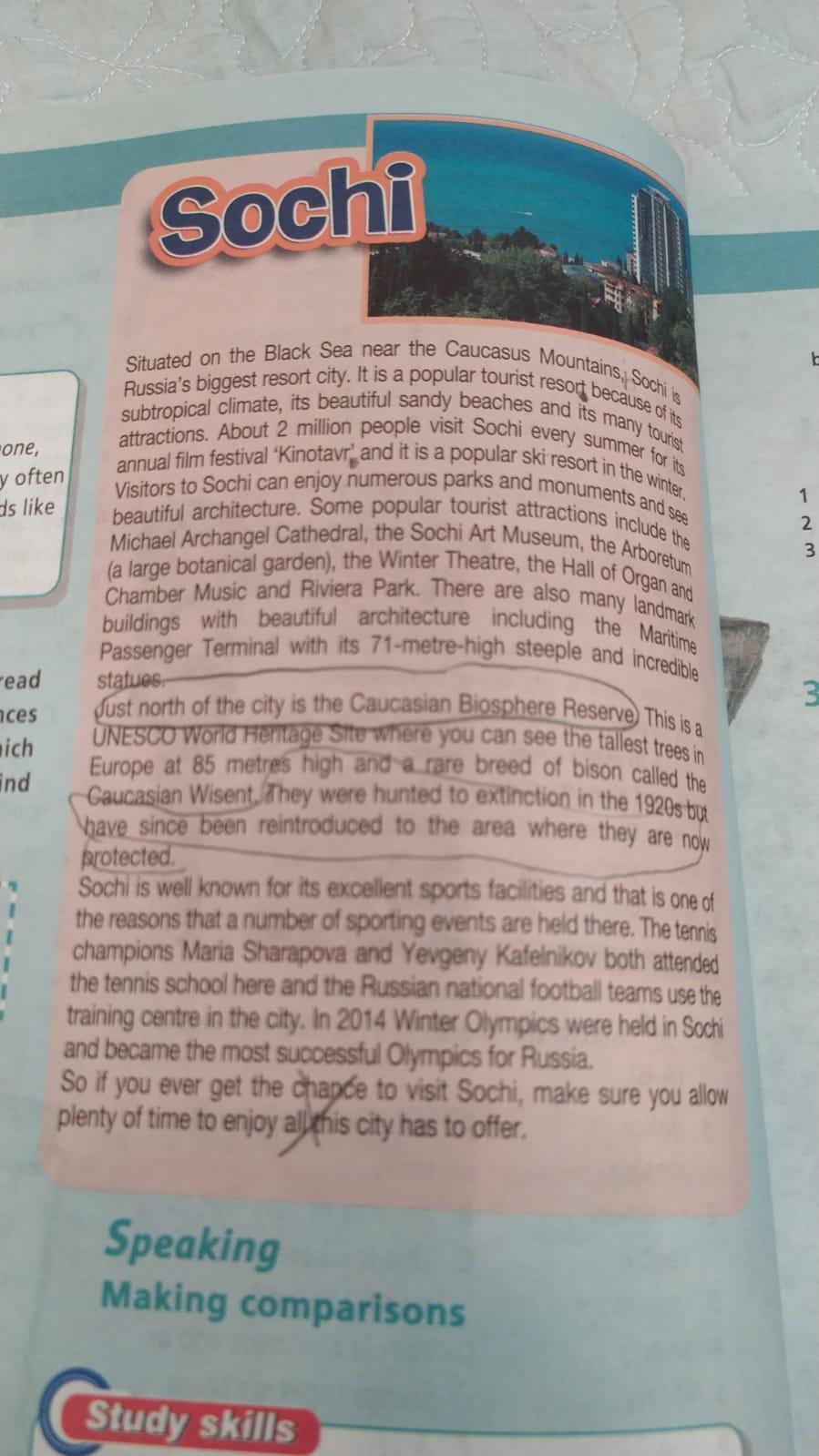 Во-перых, y часто похож на ead расположенный на Черном море недалеко от кавказских гор, Сочи является крупнейшим курортным городом России. это популярный туристический курорт из-за субтропического климата, его прекрасных песчаных пляжей и множества туристических достопримечательностей. около 2 миллионов человек посещают Сочи каждое лето на ежегодном кинофестивале ОРТ "Кинотавр", а зимой он является популярным горнолыжным курортом. гости Сочи могут насладиться многочисленными парками и памятниками и увидеть прекрасную архитектуру. некоторые популярные туристические достопримечательности включают собор Михаила Архангела, сочинский художественный музей, дендрарий (ботанический сад), зимний театр, зал органа и музыки и парк Ривьера. здесь также есть много знаковых зданий с красивой архитектурой, включая морской пассажирский терминал с его 71-метровой колокольней и невероятными статуями. к северу от города находится Кавказский биосферный заповедник) это объект всемирного наследия ЮНЕСКО, где вы можете увидеть самые высокие деревья в Европе высотой 85 метров и редкую породу зубров, называемых кавказскими зубрами, на которых охотились до исчезновения в 1920-х годах, но с тех пор они были вновь завезены в район, где они сейчас охраняются. он хорошо известен своими превосходными спортивными сооружениями, и это одна из причин, по которой здесь проводится множество спортивных мероприятий. чемпионы терниса Мария Шарапова и Евгений Кафельников оба посещали школу тенниса, а сборные России по футболу пользуются тренировочным центром в городе. в 2014 году зимние Олимпийские игры прошли в Сочи и стали самыми успешными олимпийскими играми России. поэтому, если вы получите возможность посетить Сочи, убедитесь, что у вас есть достаточно времени, чтобы насладиться всем, что может предложить этот город.
